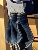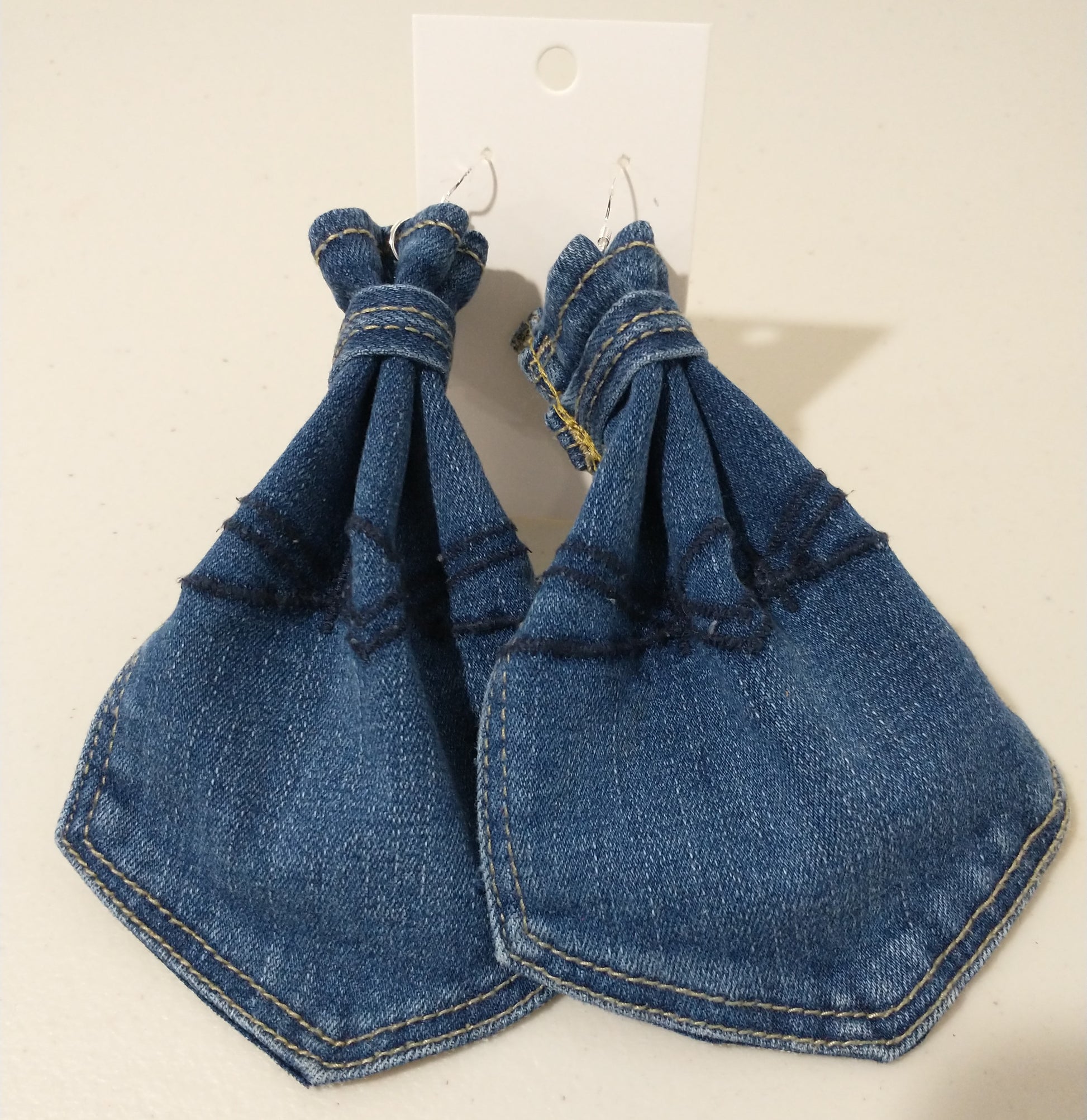 These denim pocket earrings are made with denim backings and sterling silver hooks.