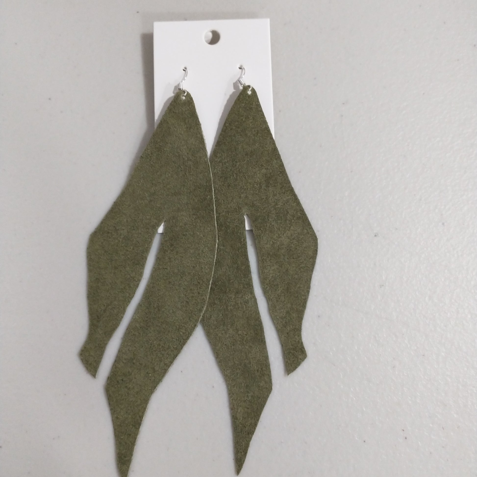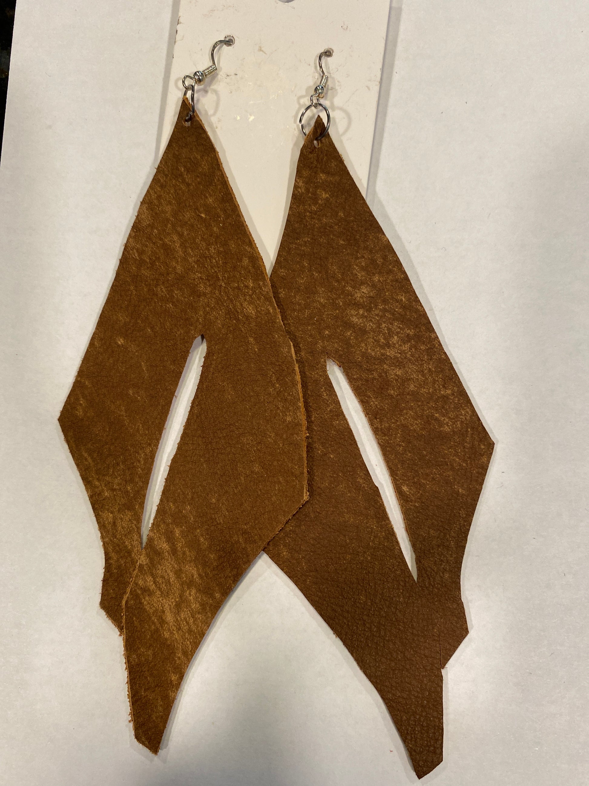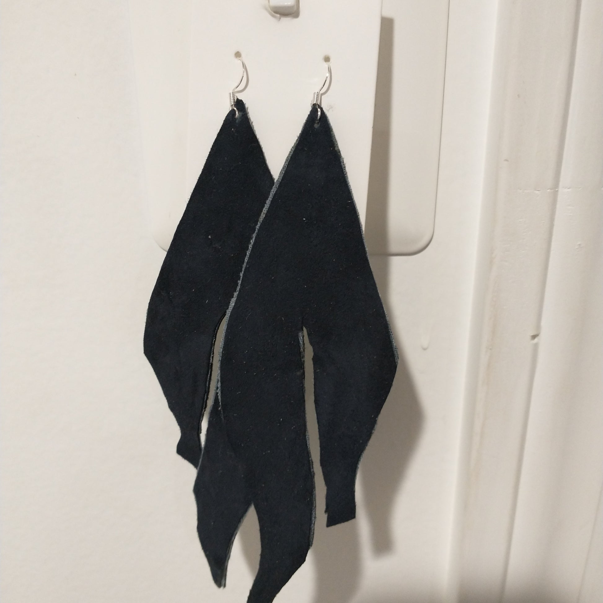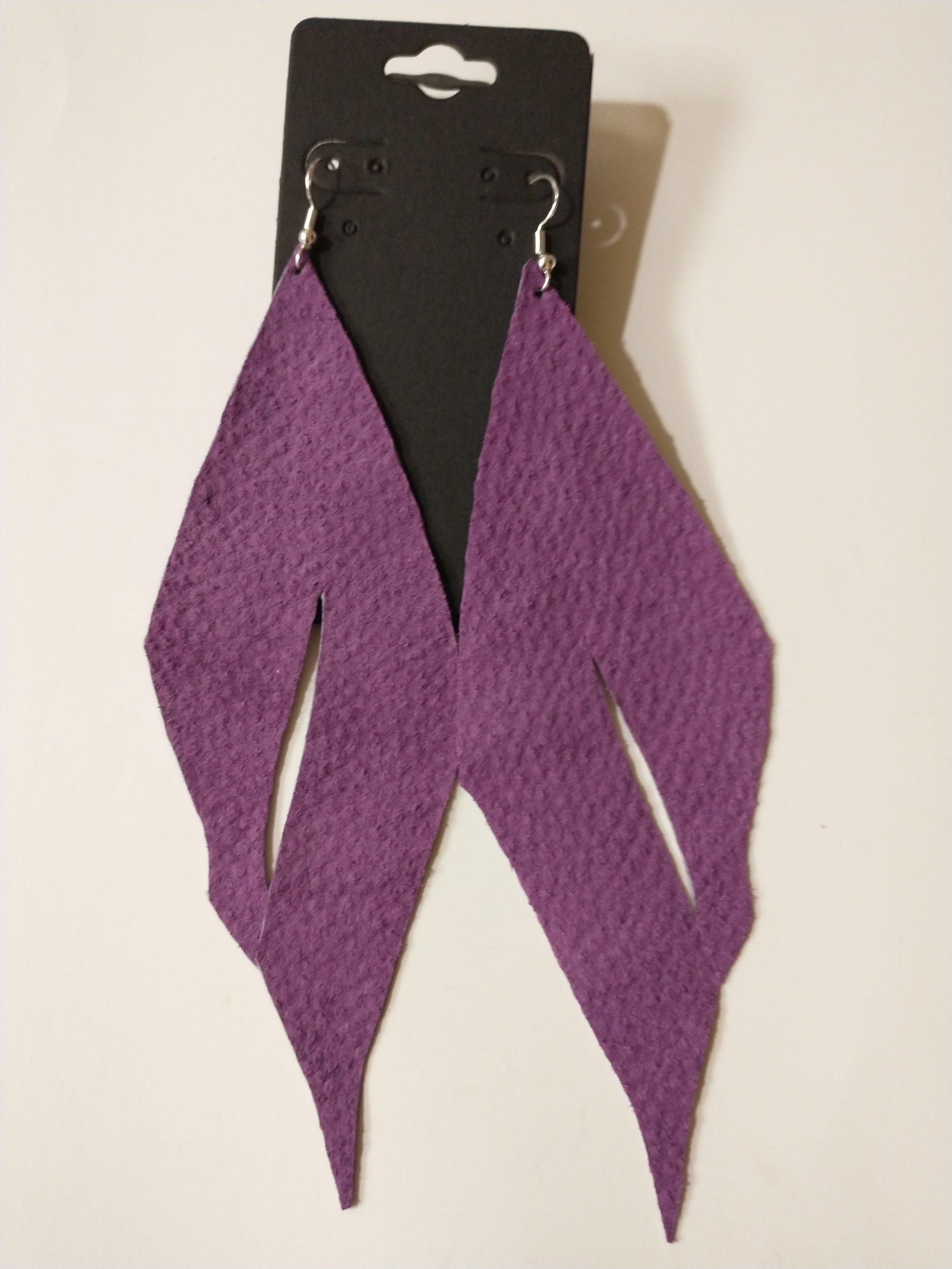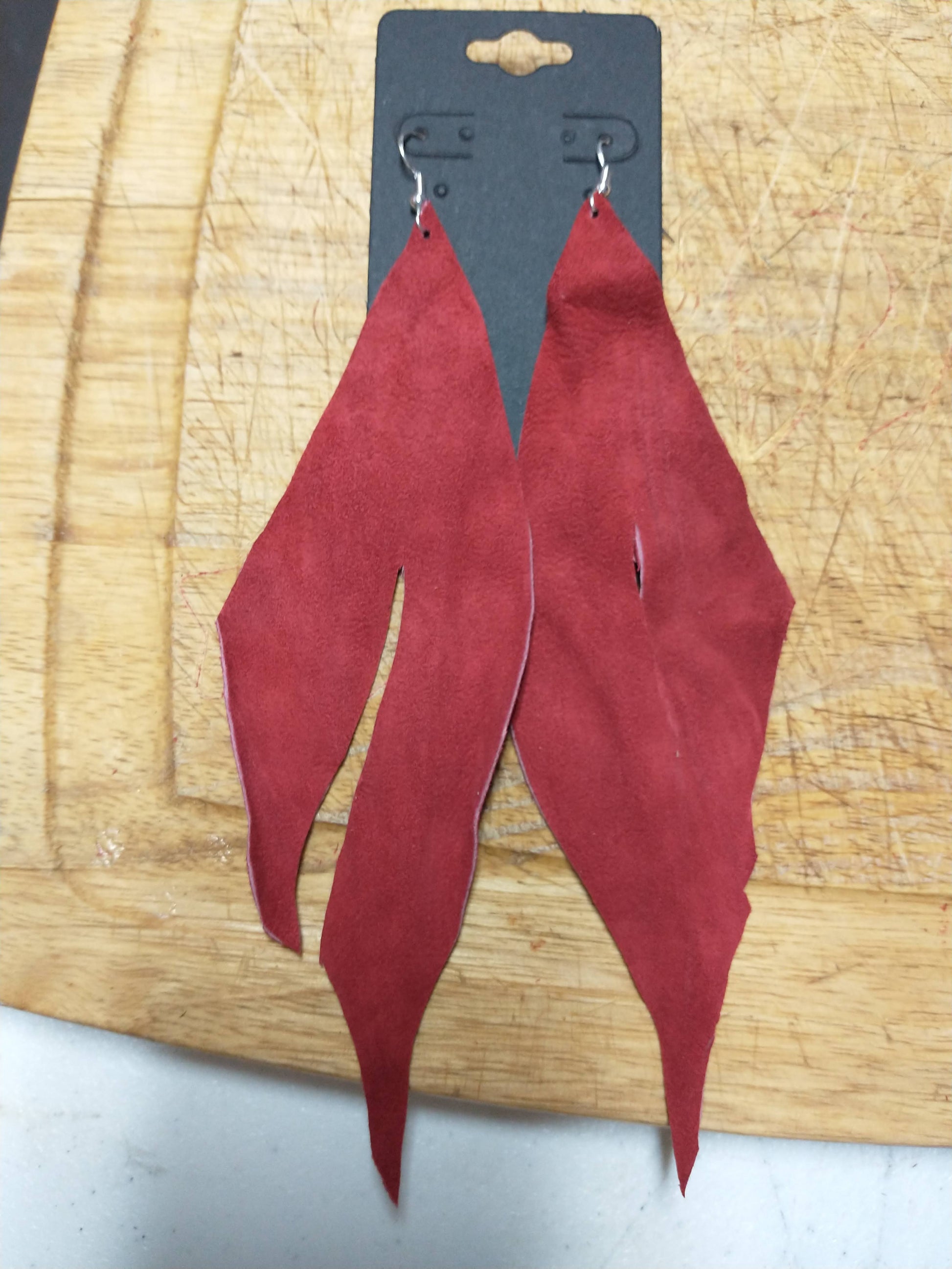 These styled earrings were influenced by boot art and are handmade by Sherry. Made of genuine suede and leather with sterling silver hooks, they are lightweight and soft.