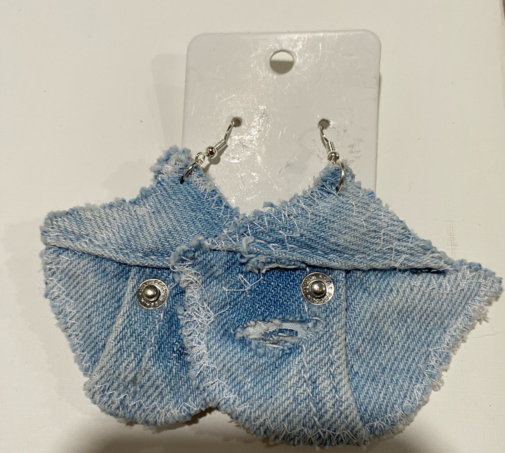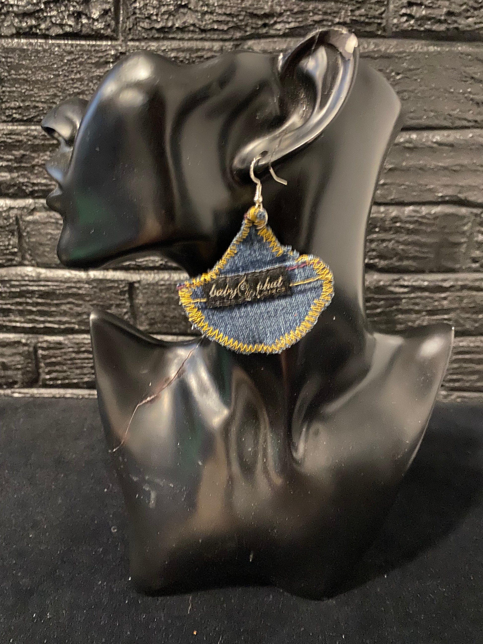 Gingko leaf denim earrings stitched with threads, sometimes embellished with metals and sterling silver hypoallergenic hooks, they are perfect with your denim looks!