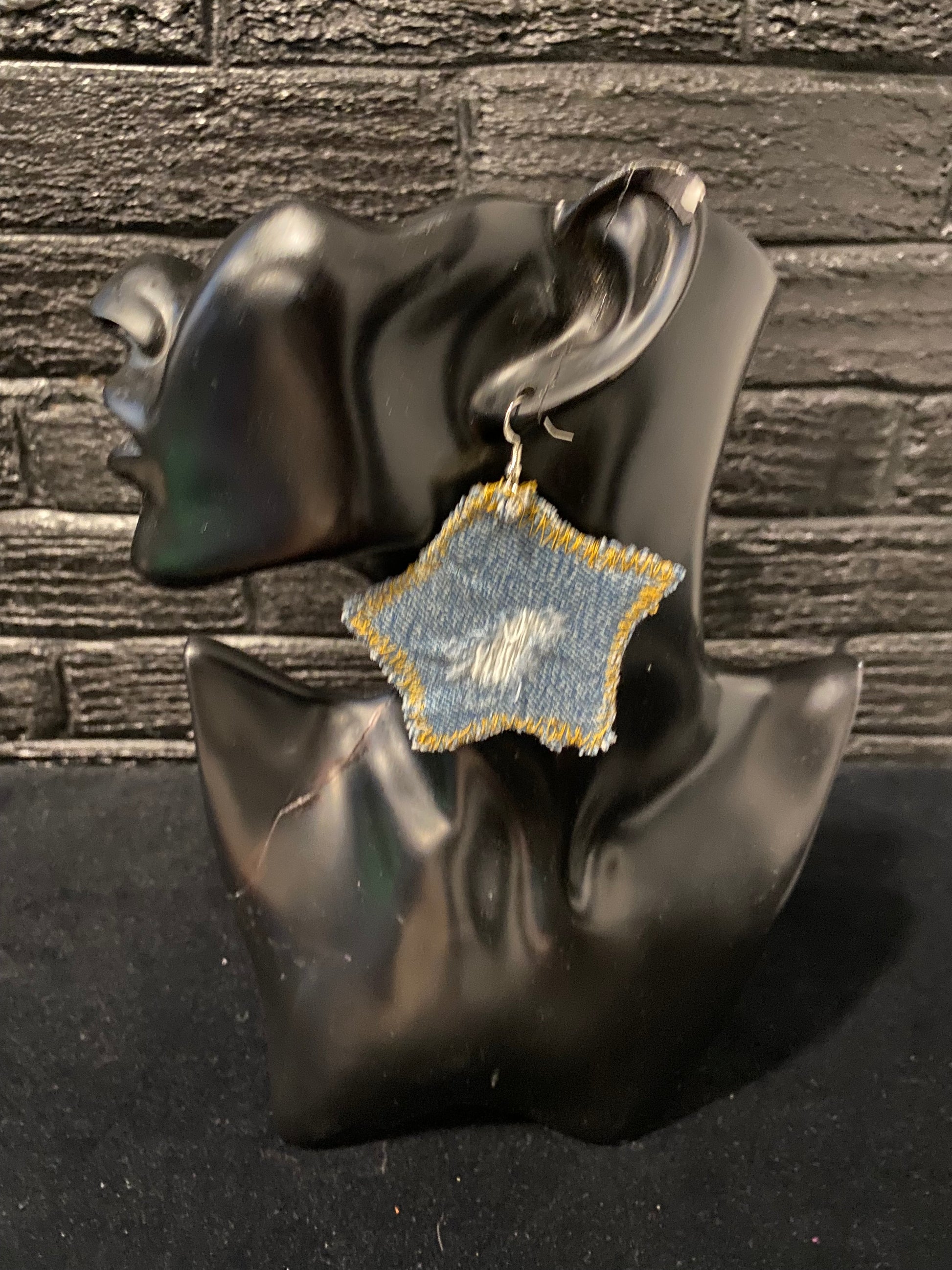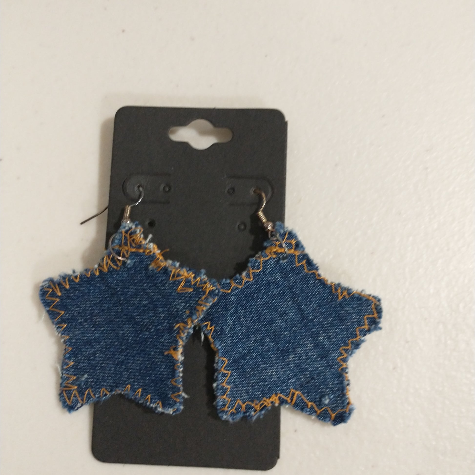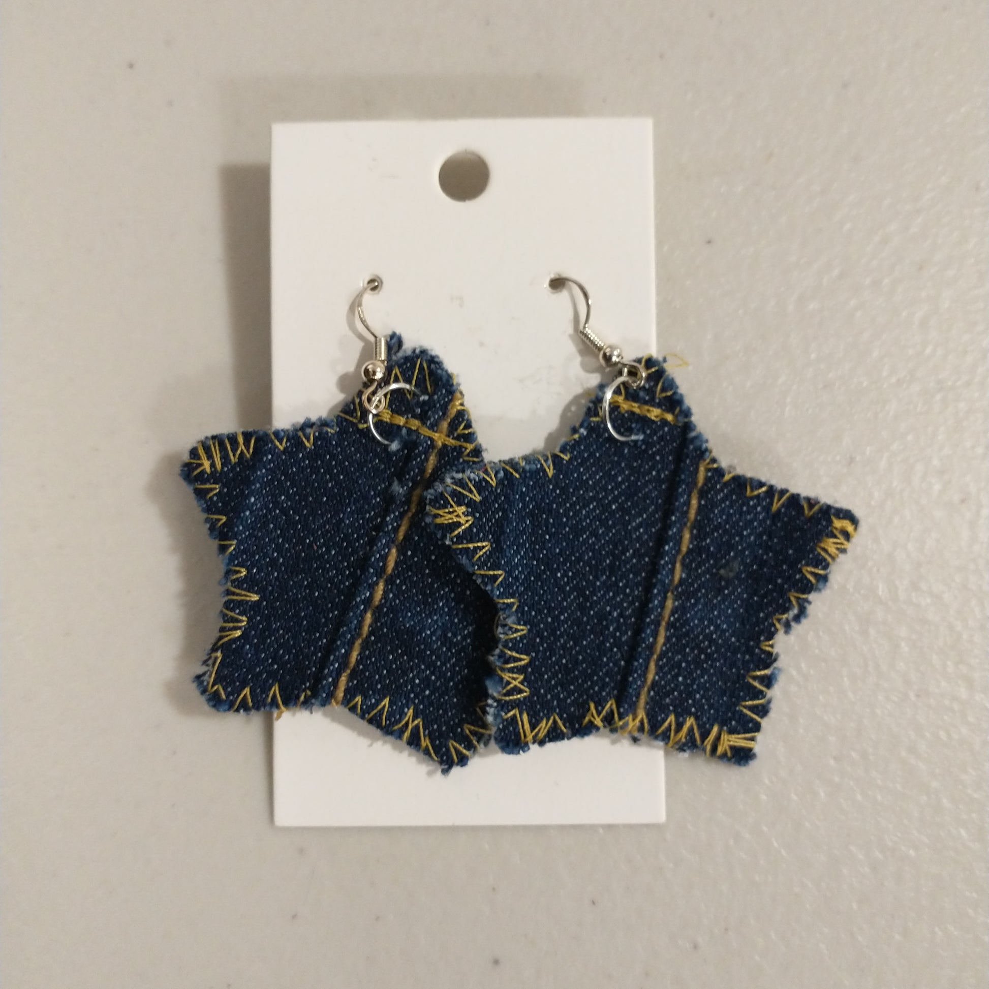 These unique earrings are made of denim fabric with sterling silver hooks. They will match your favorite denim looks.