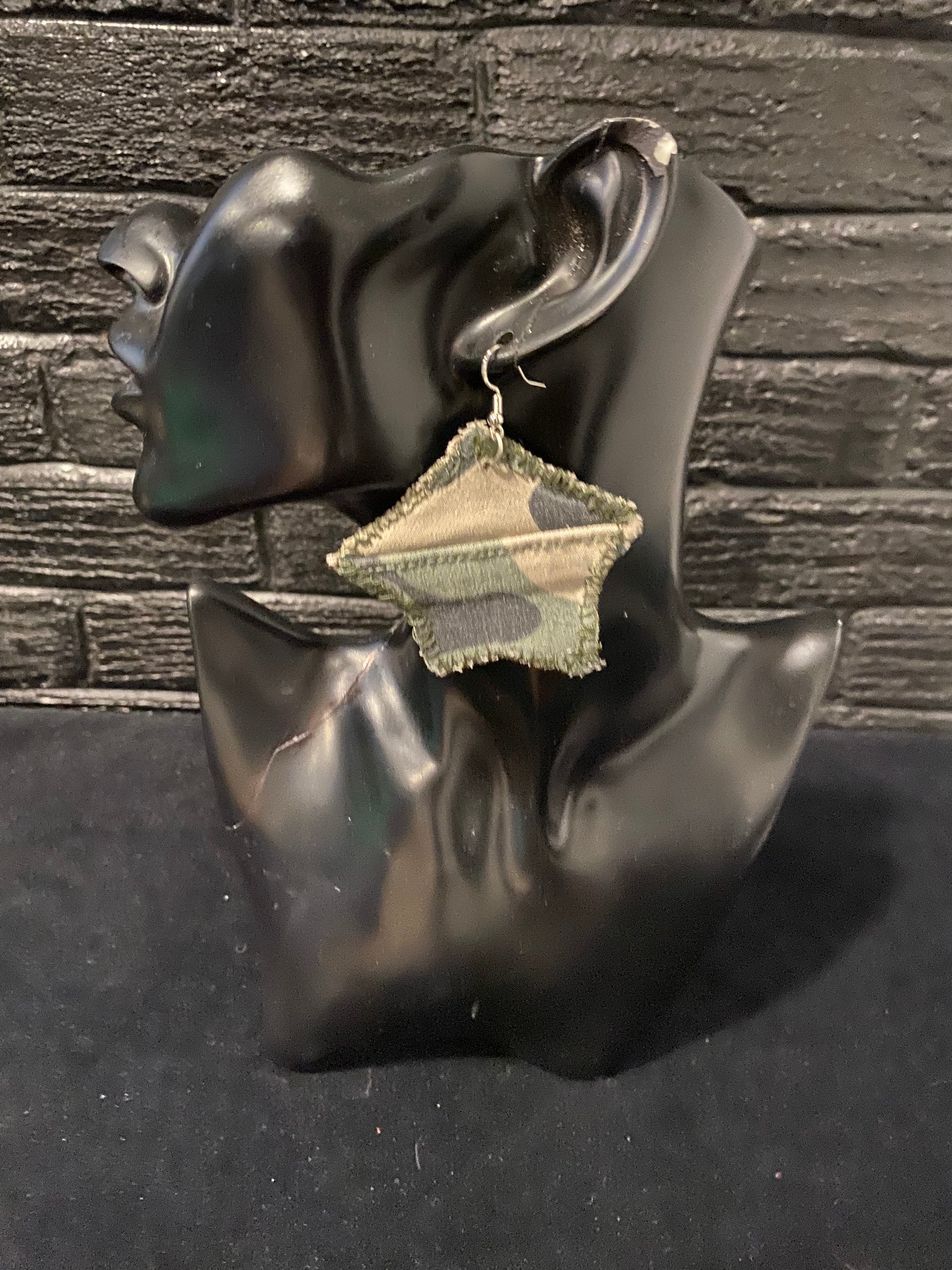 Camouflage Star earrings medium size, with sterling silver hypoallergenic hooks are stitched with style to coordinate with all your camo looks!